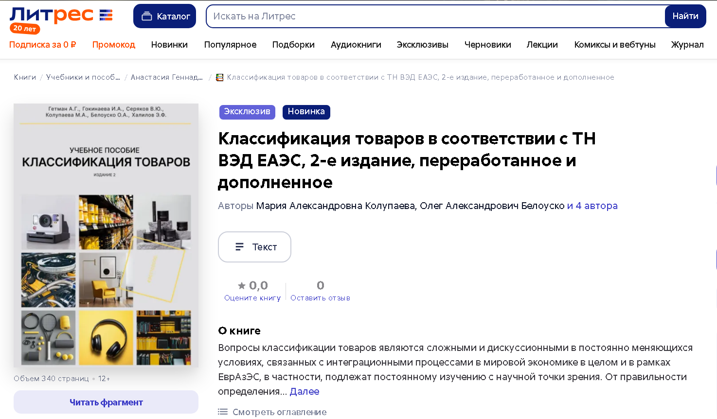 В мобильном приложении «Литрес: Книги» находите книгу «Классификация товаров в соответствии с ТН ВЭД ЕАЭС, 2-е издание, переработанное и дополненное», покупаете, читаете прямо в приложении или скачиваете на телефон. Также можно приобрести и скачать на сайте Литрес по https://www.litres.ru/72790024/